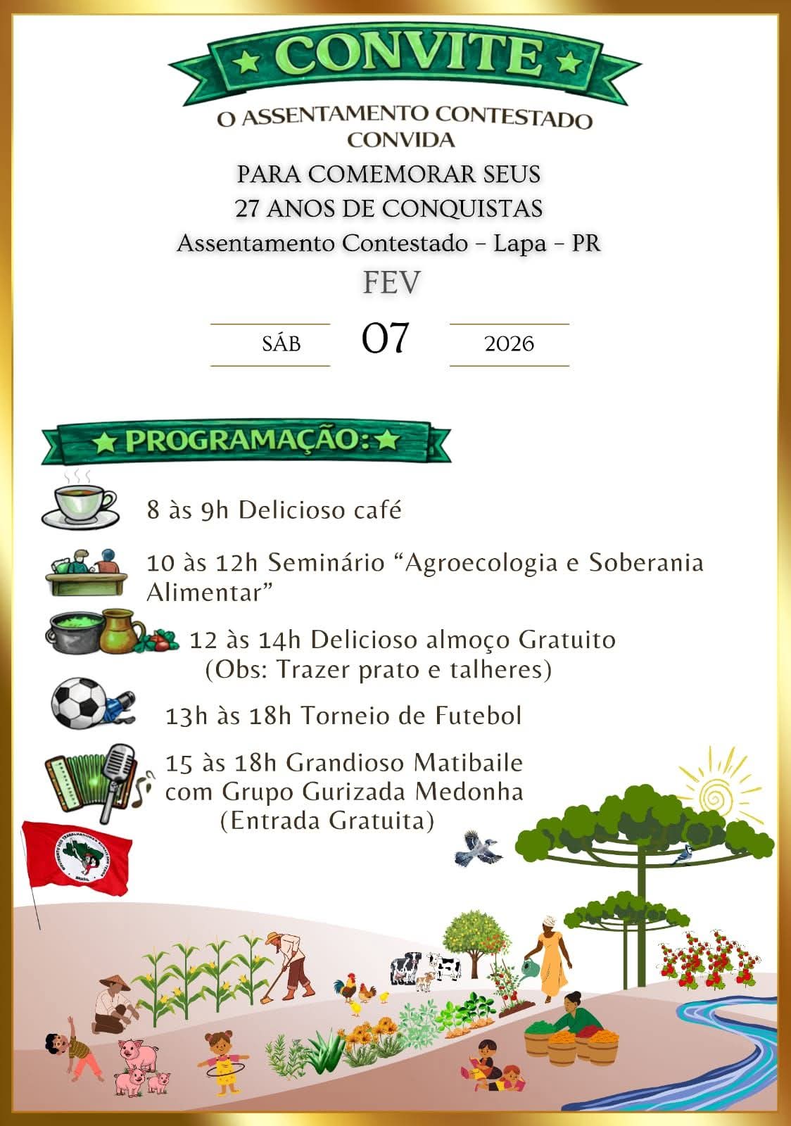 No próximo sábado (7), o assentamento Contestado, na Lapa, irá comemorar 27 anos de história e luta com uma grande festa. A expectativa é reunir mais de 600 pessoas, entre moradores da comunidade, apoiadores e visitantes, em um dia repleto de música, cultura e diversão.