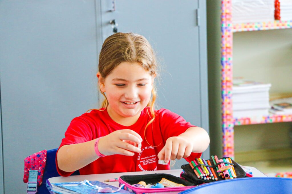 Entrega dos materiais entusiasma as crianças. (Imagens Daniel Calvo) Distribuição começou nesta quarta-feira (05) e segue nas escolas do município; compra dos kits integra investimento superior a R$ 1,4 milhão. Cerca de 8 mil kits escolares estão sendo distribuídos para estudantes da educação infantil, ensino fundamental e Educação de Jovens e Adultos (EJA) da rede municipal de ensino em Castro. A entrega pela Secretaria Municipal de Educação iniciou nesta quinta-feira (05) e continua nesta sexta.