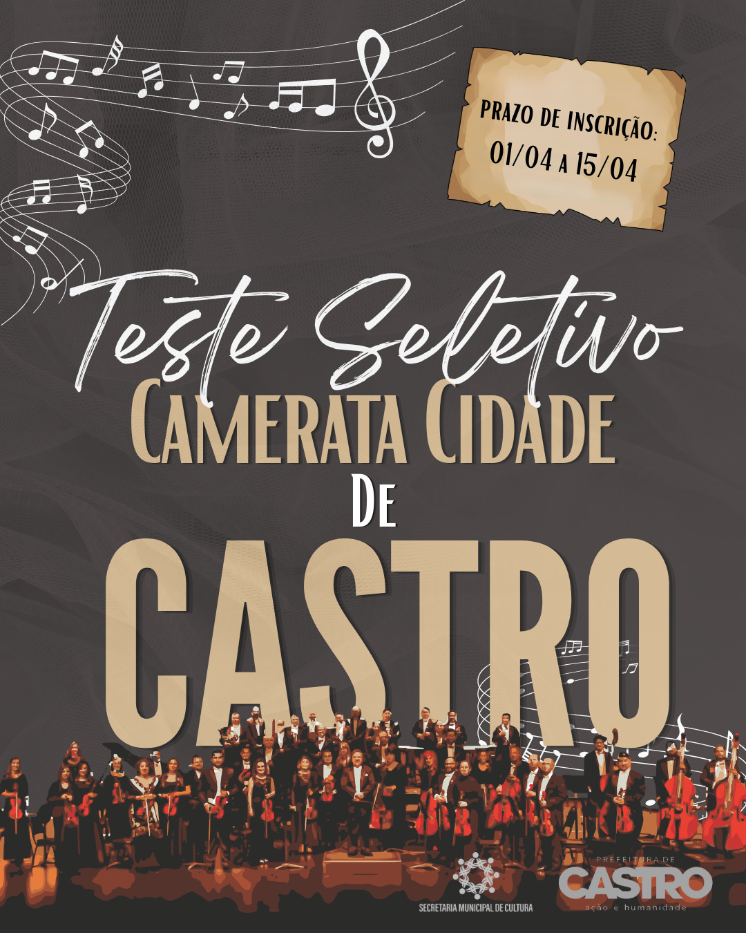 Processo seletivo busca novos talentos para integrar a formação da orquestra local. A Secretaria Municipal de Cultura, com apoio da Prefeitura Municipal, inicia no dia 01 de abril de 2026 as inscrições para músicos interessados em integrar a Camerata de Castro. O projeto tem como objetivo fortalecer a cena musical do município e promover a formação artística de instrumentistas locais.