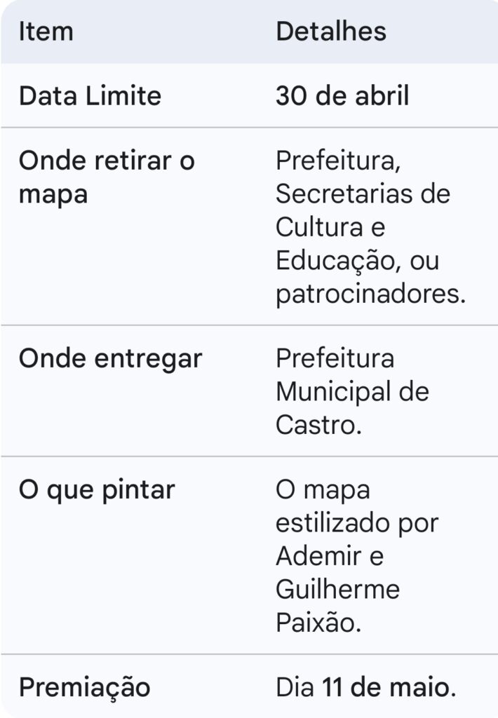 Muitas vezes deixamos a nossa expressão artística para depois, mas o “Vamos Pintar Castro” é um chamado para o presente. É a chance de ver a nossa cidade — com toda a sua riqueza histórica e geográfica — sob uma nova luz: a luz da sua criatividade.