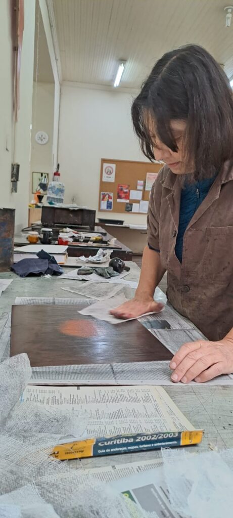 Na exposição, Eliana apresenta gravuras em metal, marcadas pelo contraste entre luz e sombra, explorando o gesto, a matéria e o silêncio em composições predominantemente em preto e branco. Já Miriam investiga a potência expressiva da cor na gravura, criando imagens em que as camadas cromáticas dialogam com o metal e com a delicadeza do processo manual.