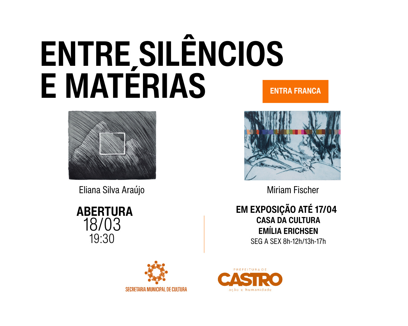 A Casa da Cultura Emília Erichsen recebe, no dia 18 de março de 2026, às 19h30, a exposição Entre Silêncios e Matérias, das artistas Eliana Silva Araújo e Miriam Fischer. A mostra apresenta ao público um diálogo sensível entre duas poéticas que se encontram na gravura em metal, explorando contrastes entre silêncio e cor, densidade e leveza. As artistas que se conheceram no ateliê de gravura do Solar do Barão, perceberam com a convivência e as trocas de experiências que tinham afinidades e interesses em comum, resultando na decisão de unir seus trabalhos para apresentar a pesquisa também fora dos grandes centros.