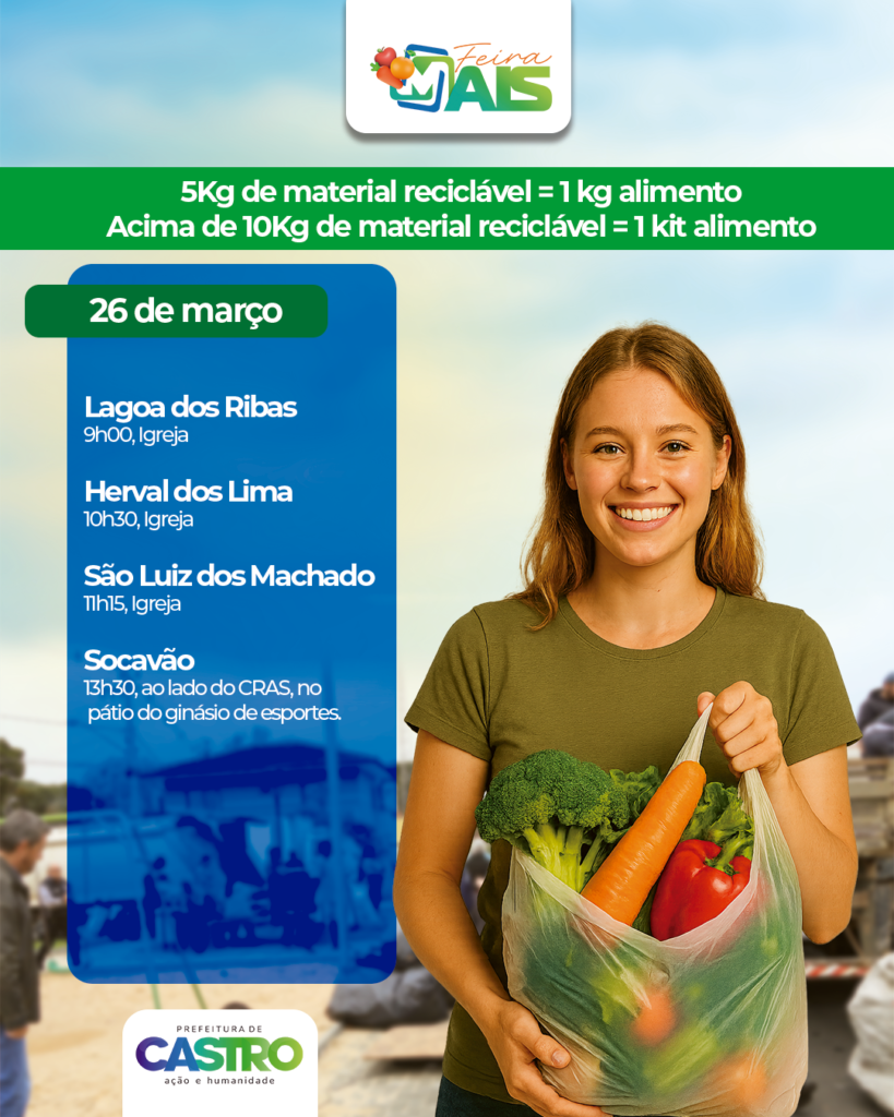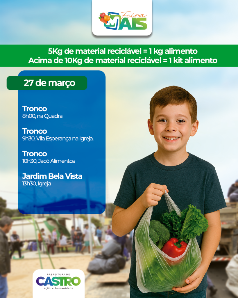Feira Mais leva troca de recicláveis por alimentos a oito comunidades nesta semana Programa da Prefeitura percorre localidades da cidade e do interior nos dias 26 e 27, incentivando a reciclagem e garantindo alimentos da agricultura familiar Mais de 10 toneladas de alimentos já foram distribuídos às famílias em 2026 Nesta semana tem ação do programa Feira Mais em Castro, levando a troca de materiais recicláveis por alimentos frescos para comunidades da cidade e do interior. A iniciativa da Secretaria Municipal de Agricultura vai percorrer oito localidades nesta quinta (26) e sexta-feira (27). A dinâmica permanece a mesma: a cada cinco quilos de materiais recicláveis entregues, o participante recebe um quilo de alimento. Quem levar mais de 10 quilos garante um kit completo com itens da agricultura familiar. São aceitos papel, plástico, metal e vidro. Não entram na troca materiais como borracha, pneus, madeira, vidro de para-brisa, roupas e calçados. Além de incentivar práticas sustentáveis e fortalecer a coleta seletiva no município, o programa também contribui para a geração de renda no campo e para o acesso das famílias a alimentos frescos e de qualidade. Os recicláveis arrecadados são destinados à Associação Convicção Ambiental, beneficiando diretamente os catadores. Somente neste ano, já foram recolhidas mais de 21 toneladas de materiais recicláveis e entregues quase 11 toneladas de alimentos, atendendo cerca de mil pessoas. A orientação da Secretaria Municipal de Agricultura é para que os participantes levem os materiais recicláveis limpos e separados, facilitando o processo de pesagem e organização da ação.