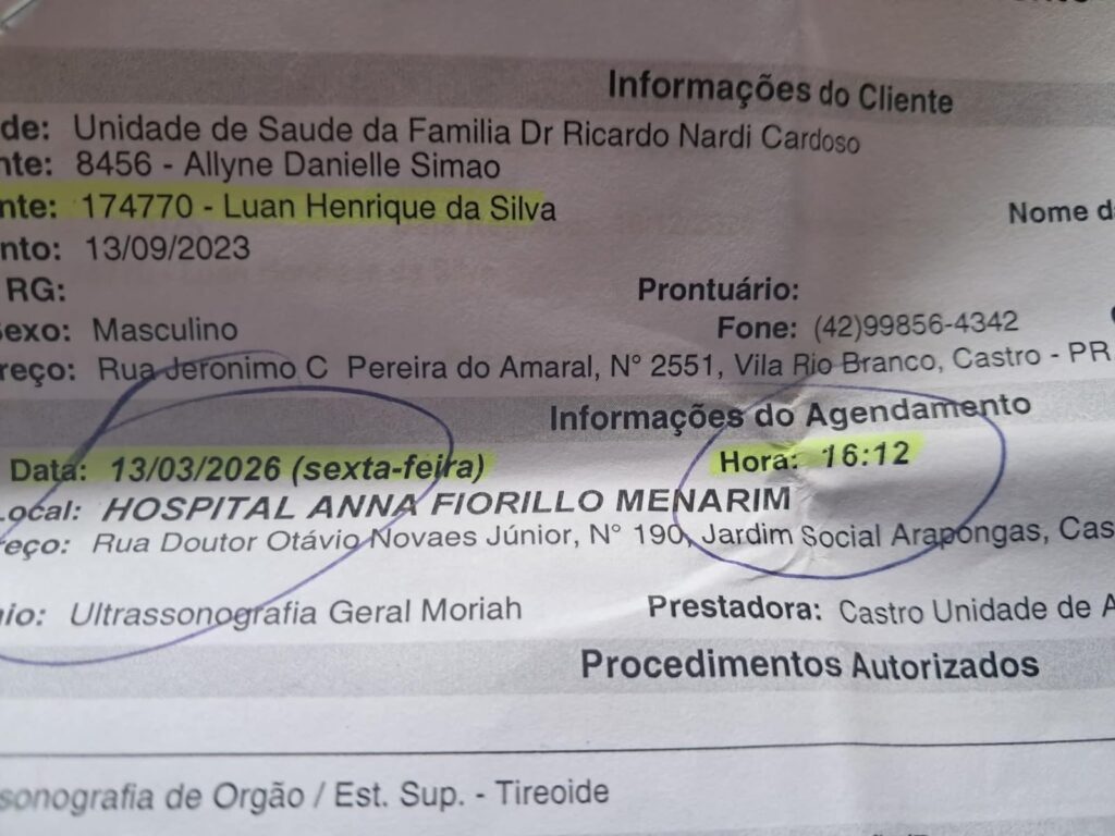 Segue relato da acompanhante (sem edições) Oque falar sobre a saúde em Castro né? Meu irmão tinha um exame pra fazer hoje dia 13/03 as 16:12 cheguei no hospital não era nem 16:04 estava indo em direção dessa recepção do vídeo vi um senhor que certamente foi mandado ir outro dia nisso uma mulher já fechando a porta e quando me viram pegaram as bolsa e saíram correndo, fui na recepção principal perguntei onde poderia ir pra fazer o exame a mulher da recepção principal disse que era na outra nisso essas moças que saíram correndo apareceram ali ela perguntou se o médico ainda tava ali elas disseram que sim, e dai pegaram esse papel pra ver oque era simplesmente disseram que nao tavam fazendo exame de tiroide HOJE (SENDO QUE ESTAVA MARCADO PRA HOJE) e era pra voltar outro dia com o mesmo papel de HOJE!