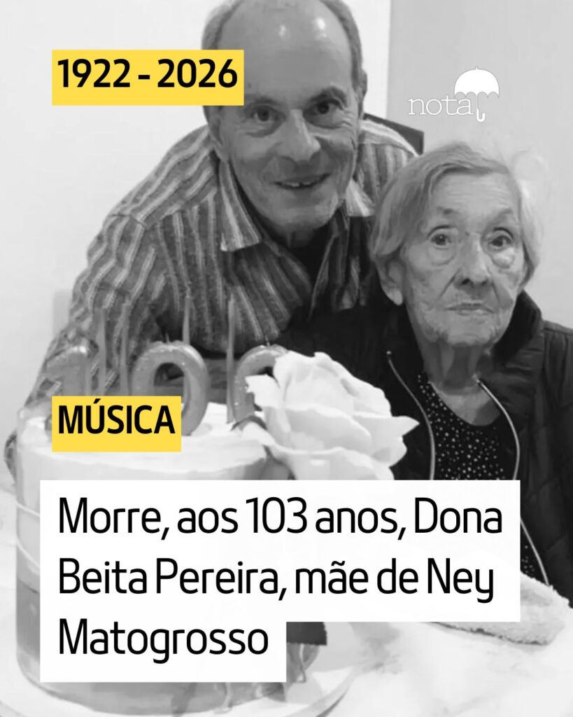 Dona Beita Pereira, mãe do cantor Ney Matogrosso, faleceu nesta terça-feira, 17, aos 103 anos, no apartamento do filho, localizado no bairro do Leblon, na Zona Sul do Rio de Janeiro.