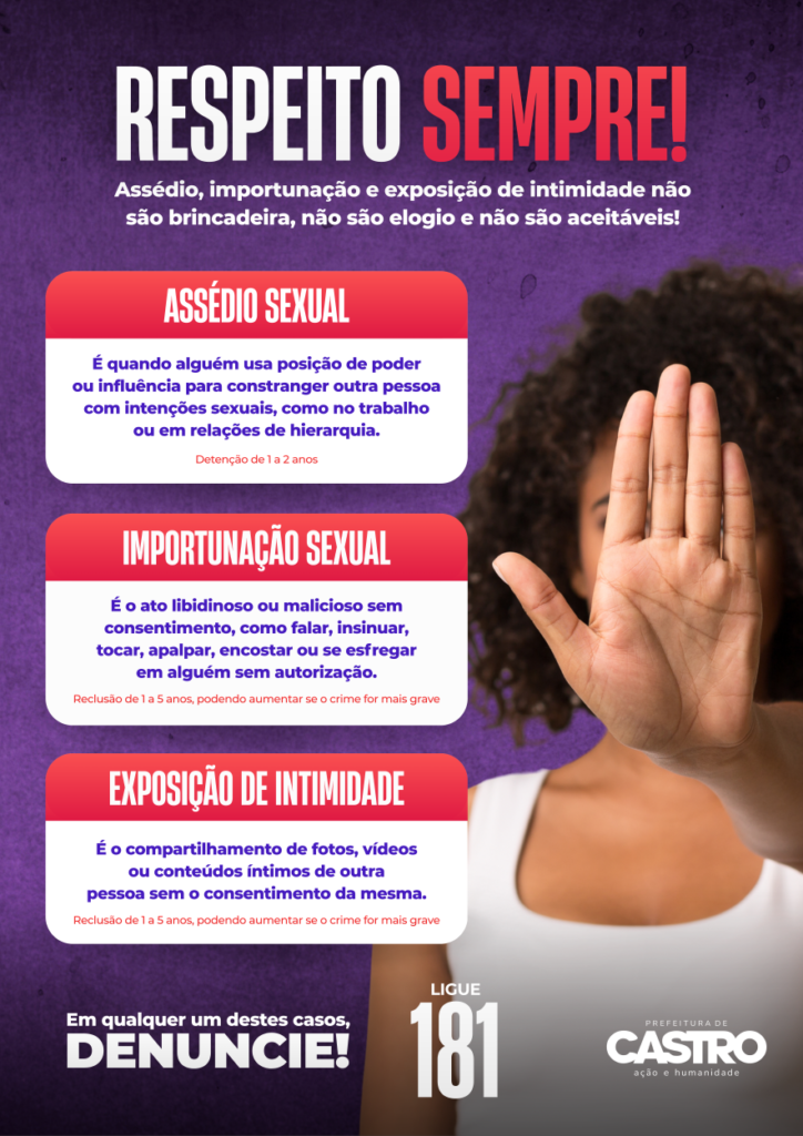 A rotina nas unidades de saúde, CRAS e secretarias de Castro ganhou um reforço importante nesta semana. Cartazes com orientações claras sobre assédio sexual, importunação e exposição de intimidade agora estampam as paredes dos órgãos municipais. O objetivo? Deixar claro que o respeito é a regra número um em qualquer ambiente de atendimento.