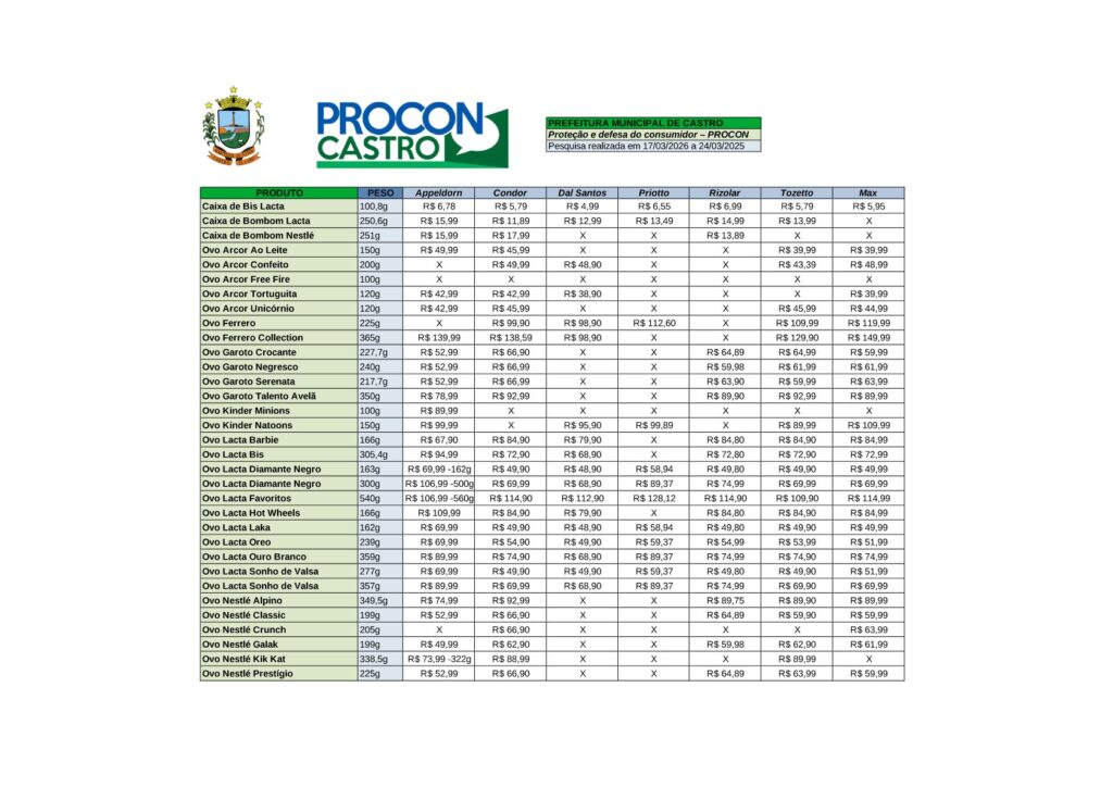 Levantamento foi feito entre os dias 17 e 24 de março em sete supermercados e revela diferenças expressivas entre estabelecimentos. Entre os ovos, preços variam de R$ 38,90 até R$ 149,99, dependendo da marca, peso e local de compra Com a proximidade da Páscoa, os ovos de chocolate já dominam as prateleiras dos supermercados de Castro. Para ajudar o consumidor a economizar, a Diretoria de Proteção e Defesa do Consumidor (Procon) realizou uma pesquisa de preços entre os dias 17 e 24 de março em sete estabelecimentos do município. O levantamento está disponível para consulta no site da Prefeitura (castro.atende.net). A pesquisa analisou diversos produtos entre ovos de Páscoa e caixas de bombom, mostrando que há opções para diferentes perfis de consumo. Entre os ovos, os preços variam de R$ 38,90 até R$ 149,99, dependendo da marca, peso e local de compra. O estudo reforça a importância de pesquisar antes de comprar. Um dos exemplos mais expressivos é o ovo Ferrero Collection 365g, que apresentou a maior variação encontrada: pode ser adquirido por R$ 98,90 em um estabelecimento e chega a R$ 149,99 em outro, uma diferença de R$ 51,09, o que representa cerca de 51,6% a mais no preço do mesmo produto. “Outros itens também apresentaram diferenças significativas, confirmando que o consumidor pode economizar valores consideráveis ao comparar preços entre os mercados”, destaca a coordenadora do Procon de Castro, Cinara Marques de Souza. Ela orienta que o consumidor vá além do preço na hora da compra. “É importante verificar se a embalagem está intacta, observar a data de validade e conferir as informações do produto. No caso de ovos com brinquedos, é fundamental checar a presença do selo do Inmetro e a indicação de faixa etária”, destaca.