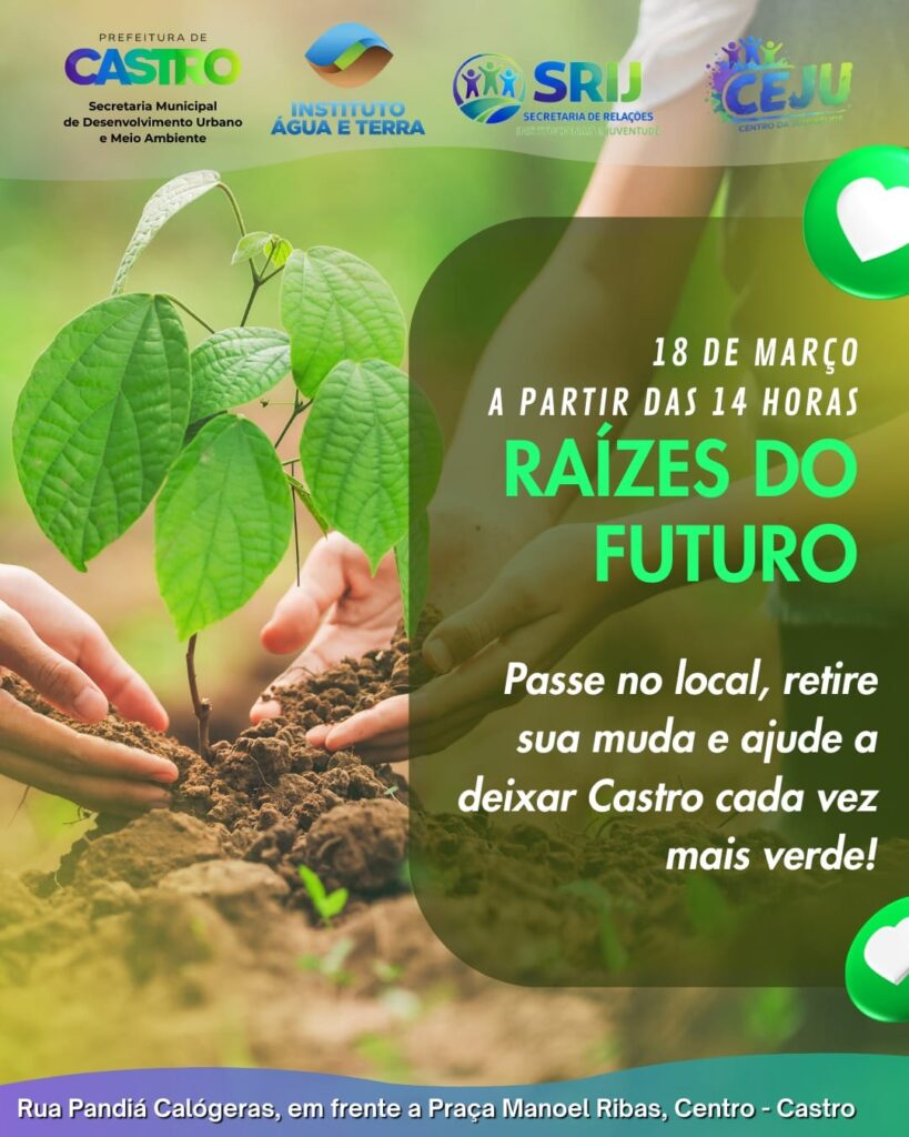 Distribuição gratuita de 2 mil mudas de árvores no dia 18 em Castro Ação integra Secretaria Municipal de Relações Institucionais e da Juventude, de Educação, Departamento de Meio Ambiente e Instituto Água e Terra. A Ação acontece a partir das 14h, na Praça Manoel Ribas, e busca fortalecer o pertencimento da juventude e da comunidade com a cidade. No dia 18 de março, a partir das 14 horas, a Secretaria de Relações Institucionais e da Juventude dá início ao projeto Raízes do Futuro, iniciativa voltada à conscientização ambiental, ao fortalecimento do sentimento de pertencimento e ao envolvimento da juventude na construção de uma cidade mais sustentável.